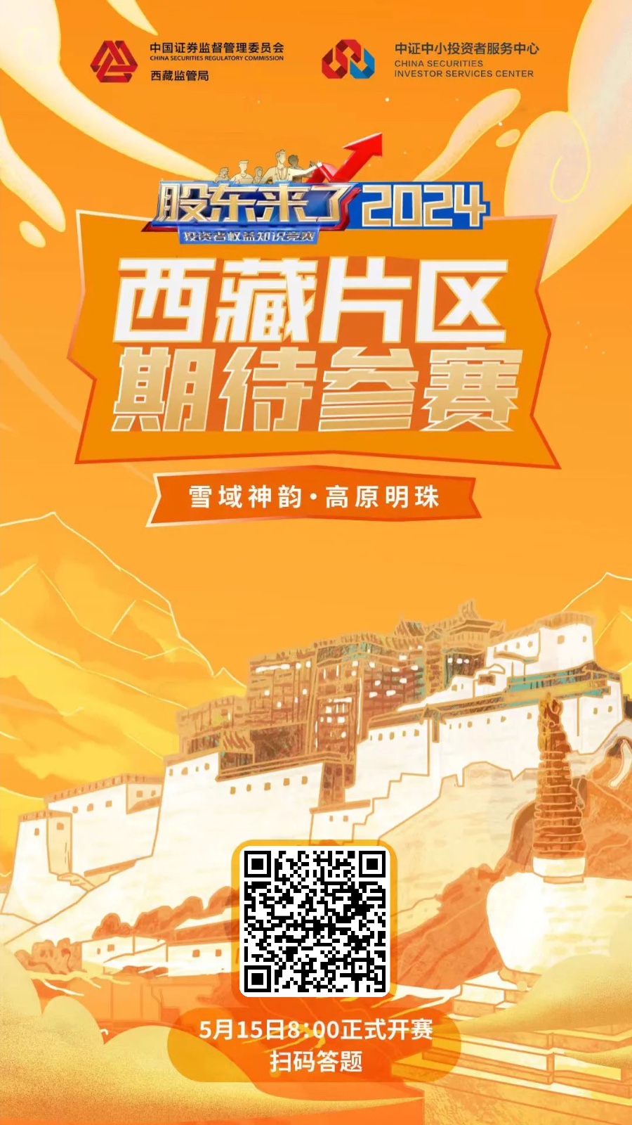 由中證中小投資者服務中心主辦,上海、江蘇、西藏、深圳證監(jiān)局聯辦的《股東來了》-2024投資者權益保護知識競賽活動于5月15日正式啟動。本次活動采用網絡答題方式,分設上海、江蘇、西藏、深圳四大片區(qū),掃描下圖二維碼即可參與“西藏賽區(qū)”答題活動,請全體同仁踴躍注冊并積極參與。